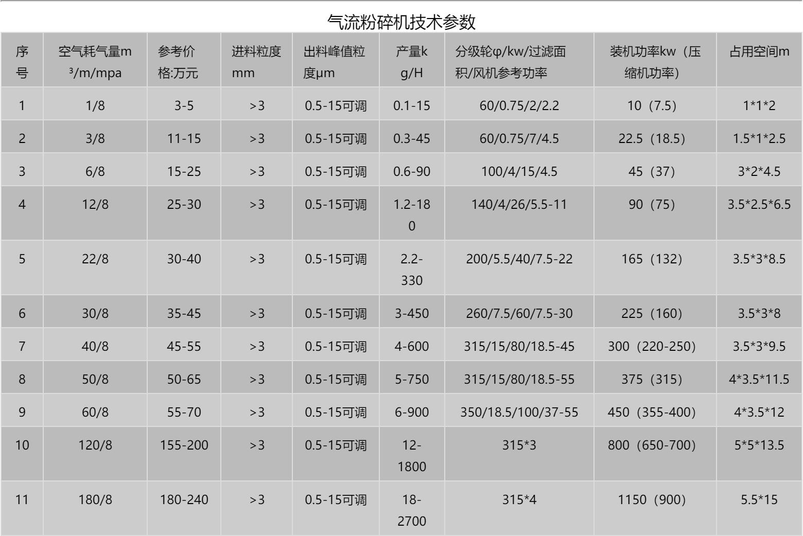 6. 氣流磨的粉碎動力源為空壓機(jī),其功率和氣量數(shù)值決定了氣流磨的產(chǎn)量。